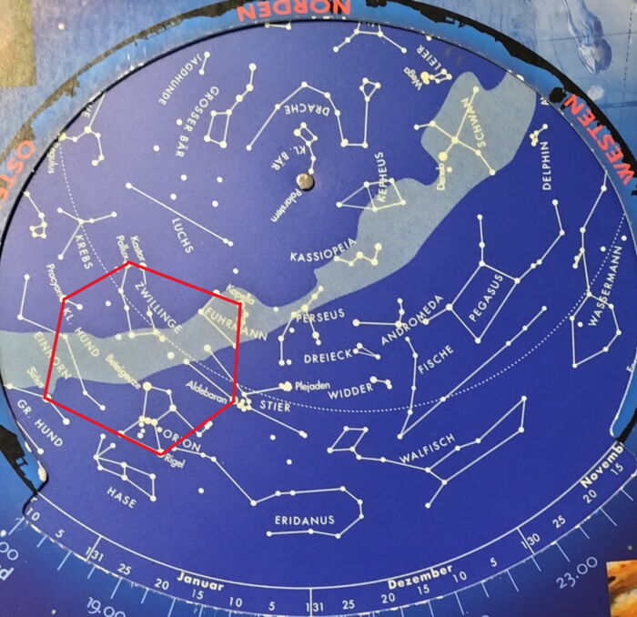 Nicht unerwähnt soll das Wintersechseck, bestehend aus Kapella im Fuhrmann, Aldebaran im Stier, Rigel im Orion, Sirius im Großen Hund, Prokyon im Kleinen Hund und Pollux in den Zwillingen. Hier kann ich nur sagen: suchen und finden! Die Sternkarte hilft.